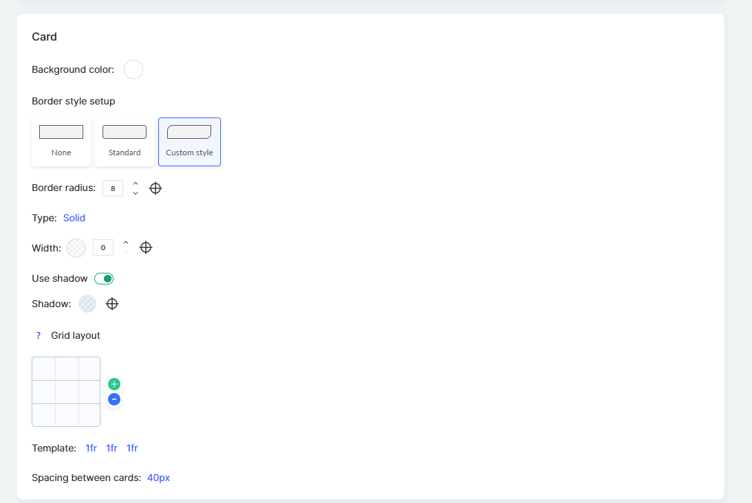 The Background color option allows you to choose the background color of the card. The Border style setting offers three options: no border, standard, or custom style.