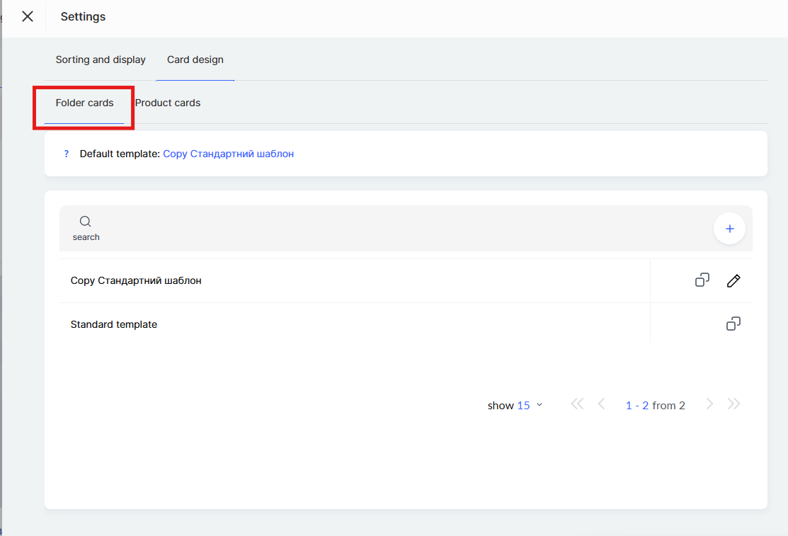 By default, the standard folder design template is available. You can copy the existing template and customize it to suit your needs, or create a new template from scratch by clicking + (plus).
