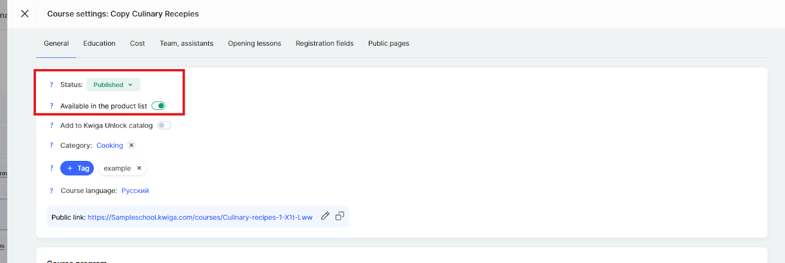 The course status must be set to Published — only then will the course become available to users. It is also important to activate the green Available in the product list toggle. If this option is disabled, the course will not appear on the school’s public page but will remain accessible via a direct link.