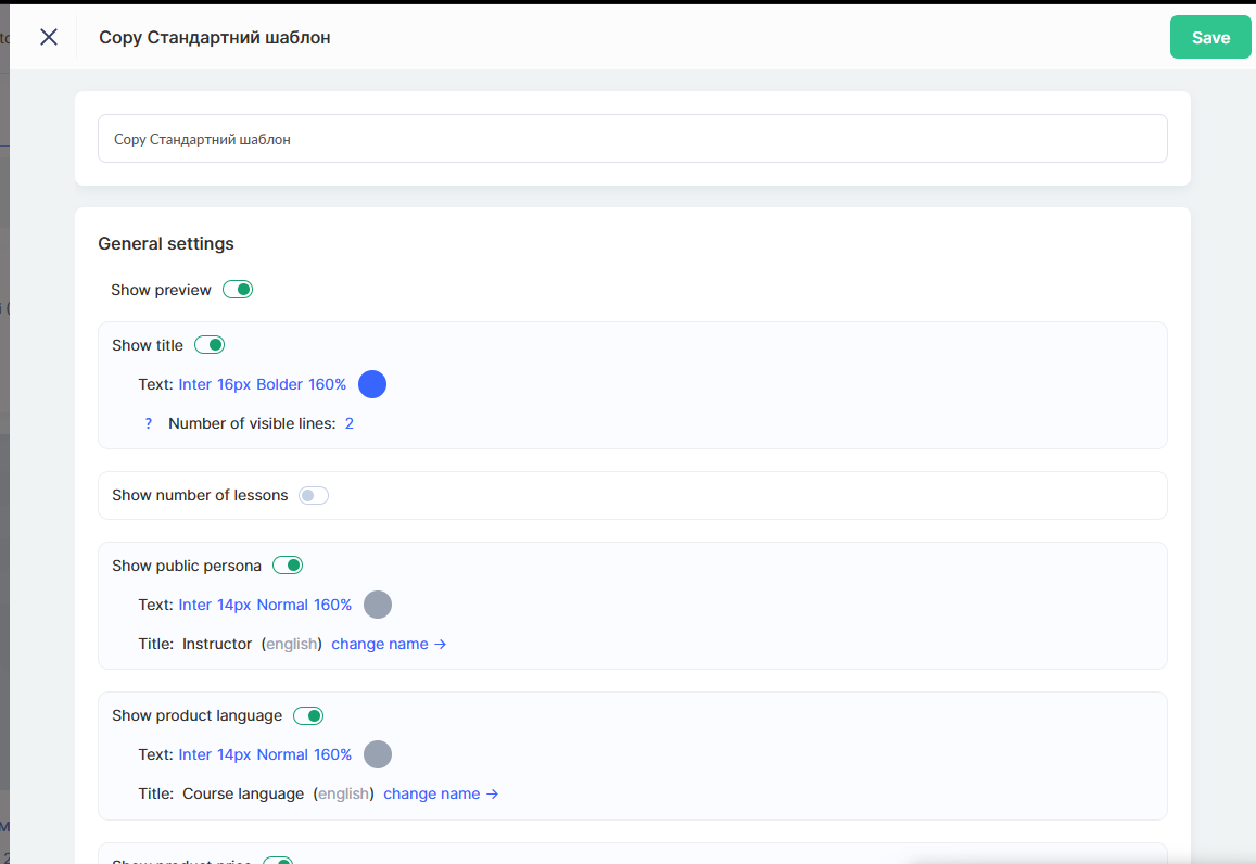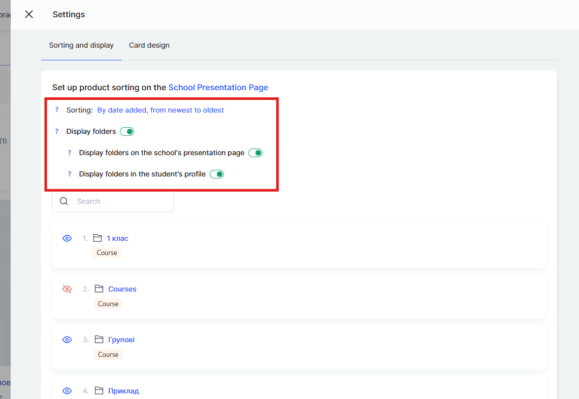 Note: Product card design settings affect how cards are displayed on the school’s presentation page and on the public course page. Here you can choose what information to show on the card (title, author, price, tags, etc.).