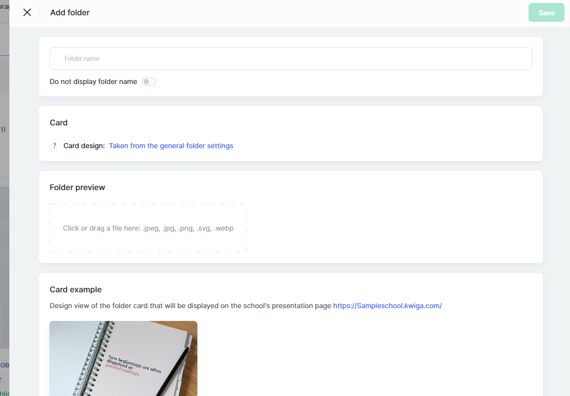 Below, the Card Preview is displayed — a preview of how the folder will look on the school’s presentation page with the selected settings.