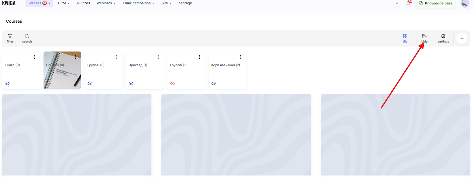 If you do not yet have folders, you need to create them. To do this, go to the Courses menu, open one of the sections in the Products block (for example, Courses), and click the +Folder button.