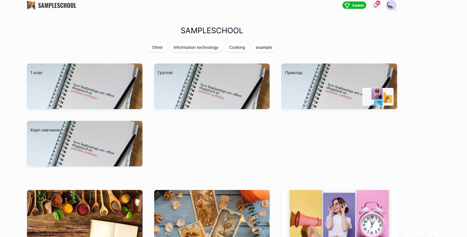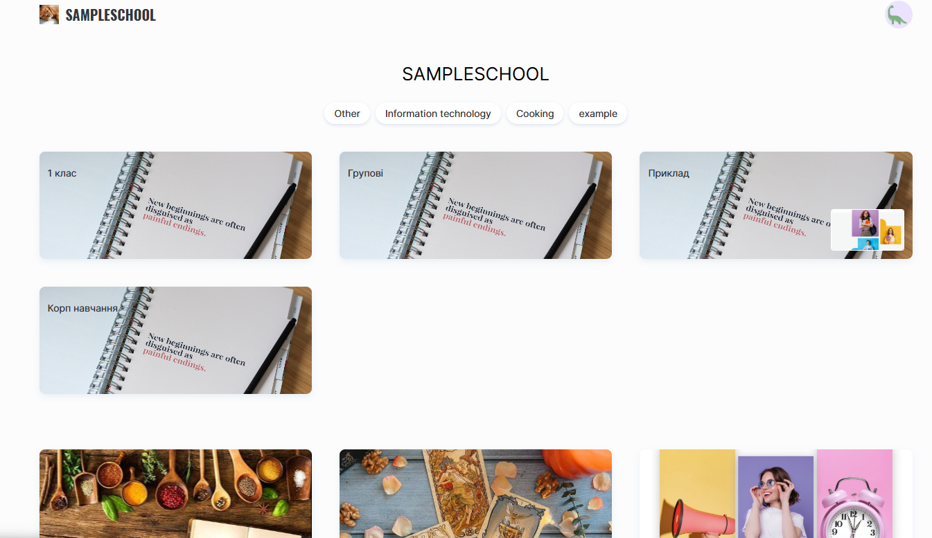 On the Kwiga platform, each educational project (school) receives its own presentation page. This is essentially the school’s main page, where published products are displayed.