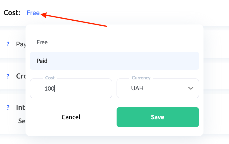 Select “Paid,” and you will immediately see additional settings where you can specify prices and currencies. Enter the maximum course price here — you’ll be able to add discounts or promotions afterward.