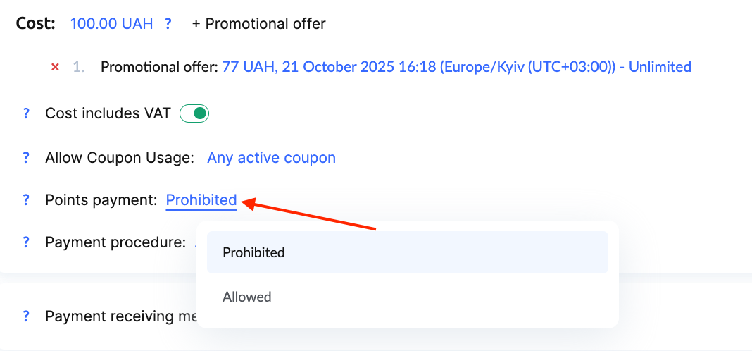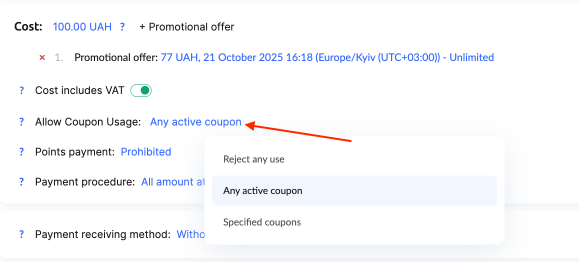 You can also restrict the use of discount coupons: either forbid all coupons, allow any active coupon, or limit usage to specific ones created for this offer. More details about coupons are available in a separate article.