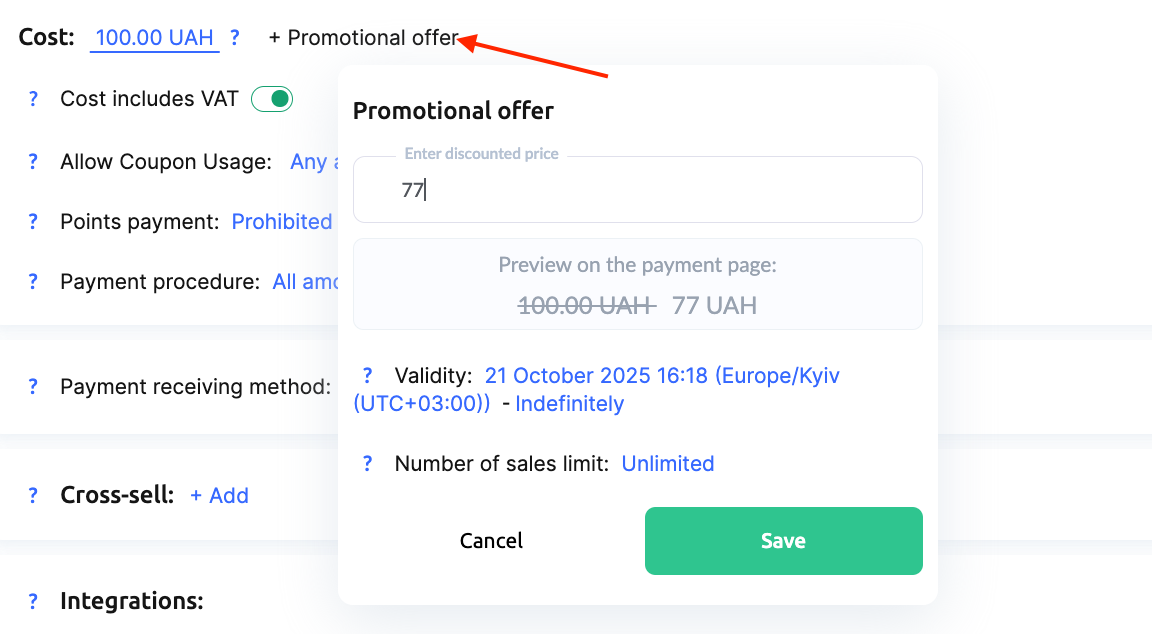 Offer validity: Defines the sales period, not the course access duration. Often set as unlimited.