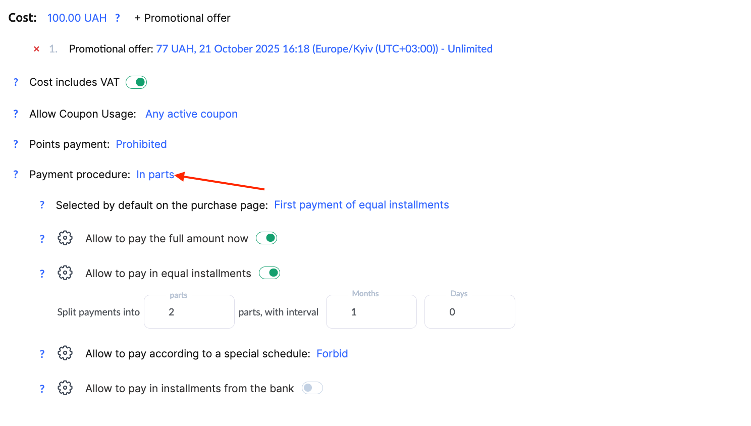 Installments — split the total cost into several payments, with customizable number of parts, intervals between them, and the amount of each payment.