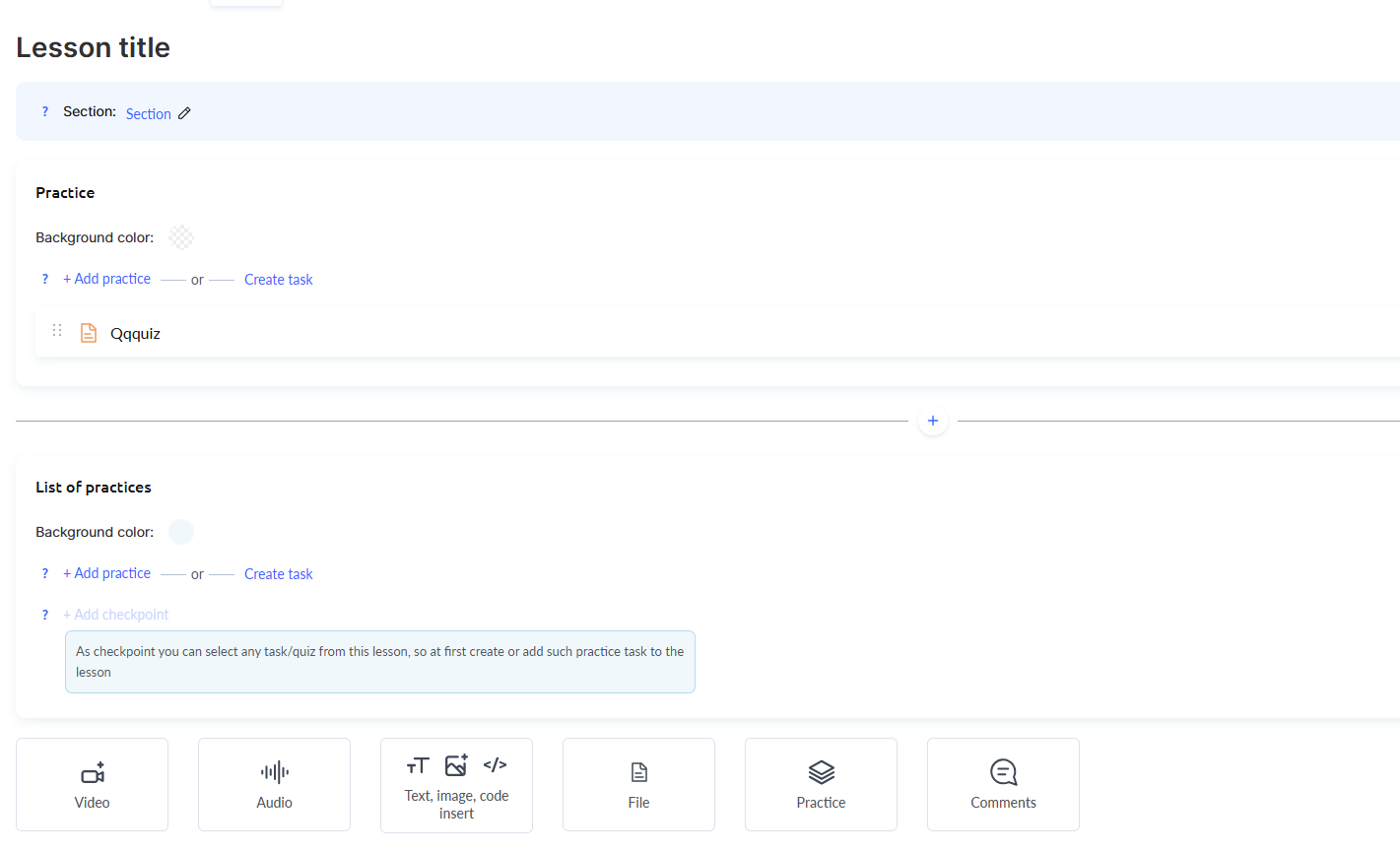 For the final assessment, add a practical assignment using the Practice button within the lesson — quizzes are created separately in the Quizzes section.
