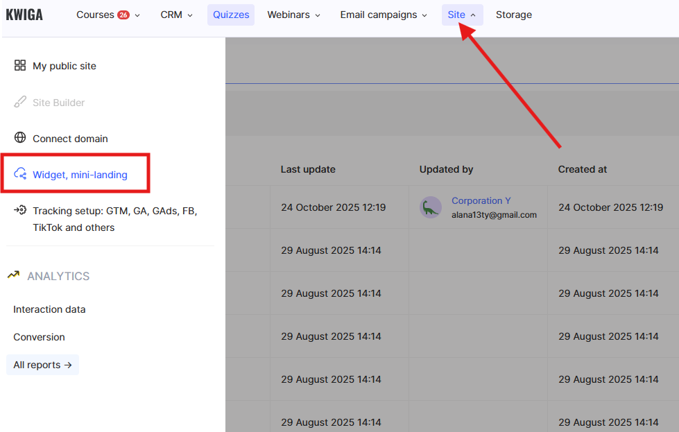 To create one: go to the Site menu → Widget, Mini Landing → +. In the builder, add text, images, and a button or form depending on the scenario: