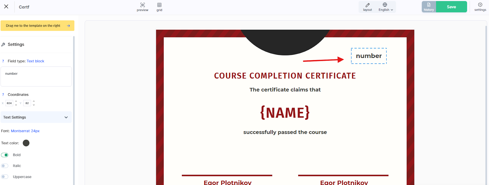 If the template is already ready without a number, drag a text block from the left panel and enter the fixed part manually in the editor.