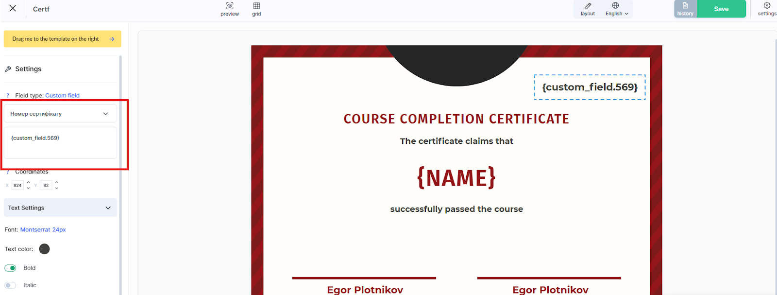 Select the “Text field” type and give it a clear name, for example, “Certificate Number.”