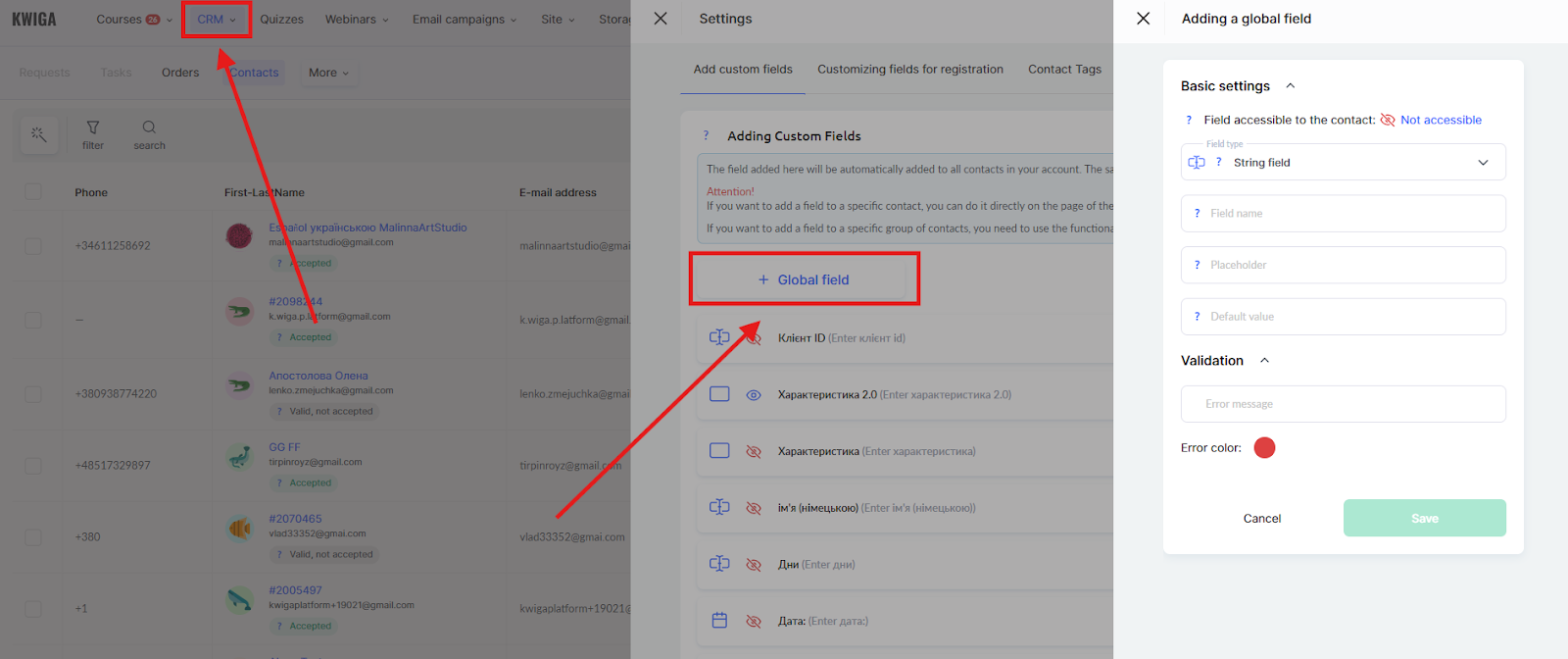 Create a custom global field for the certificate number: CRM → Contacts → Settings → + Global field.