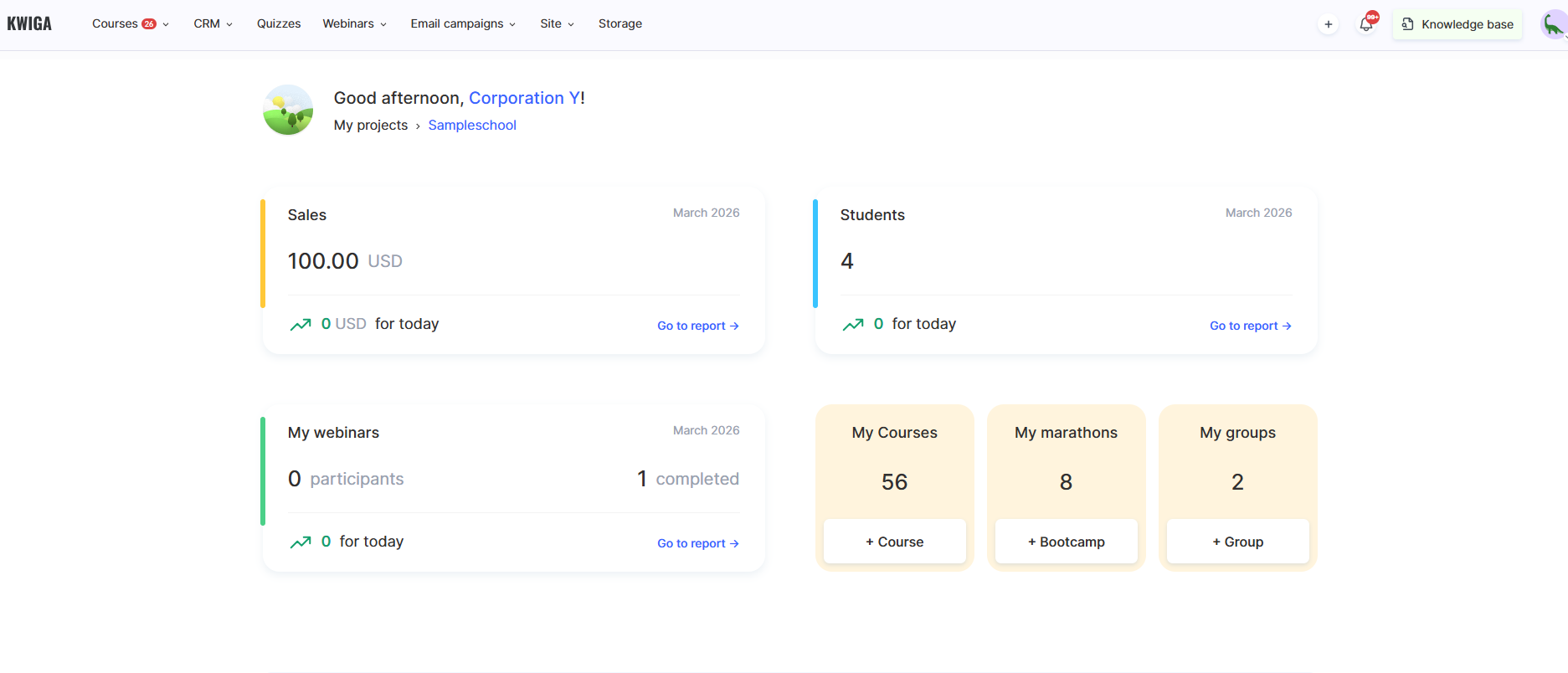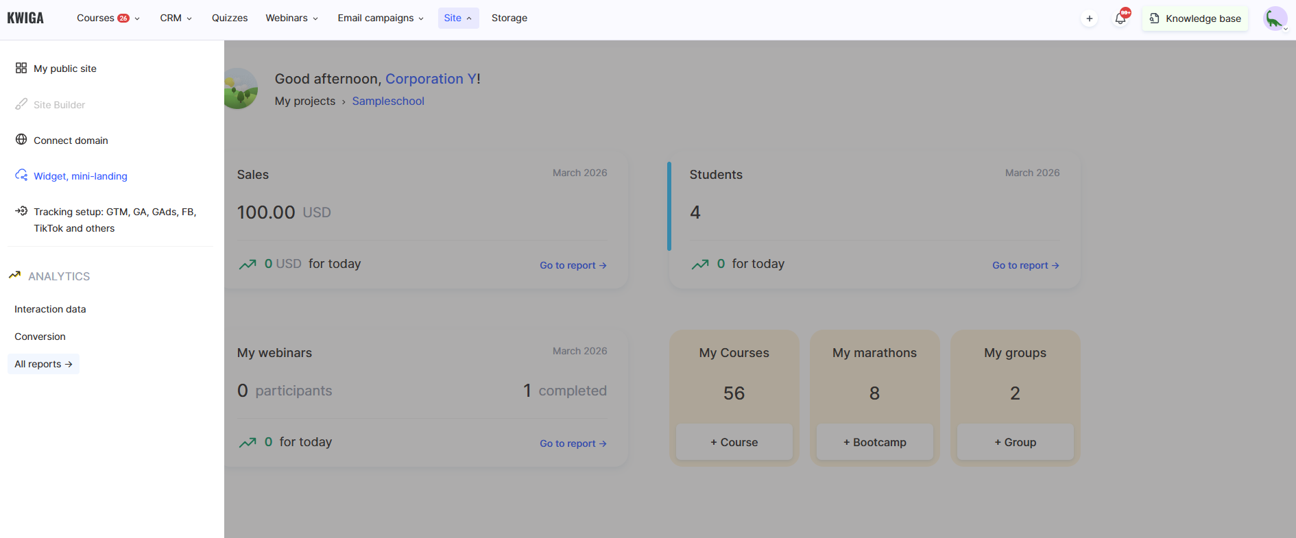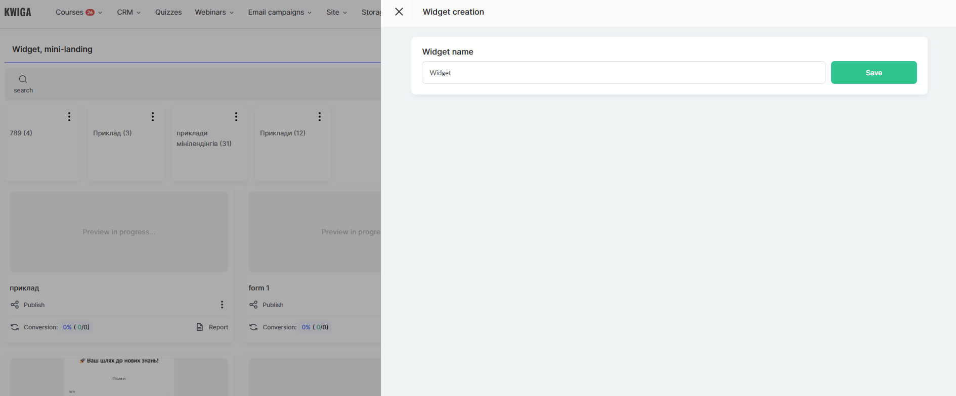 On Kwiga, you are not limited in how you can use a widget. It can be a banner, a promotional offer advertisement, a course teaser, a contact collection widget, or a quick webinar registration form, and much more. Data from the form can be sent directly to the CRM within Kwiga, as well as to other services if you use them to work with clients.