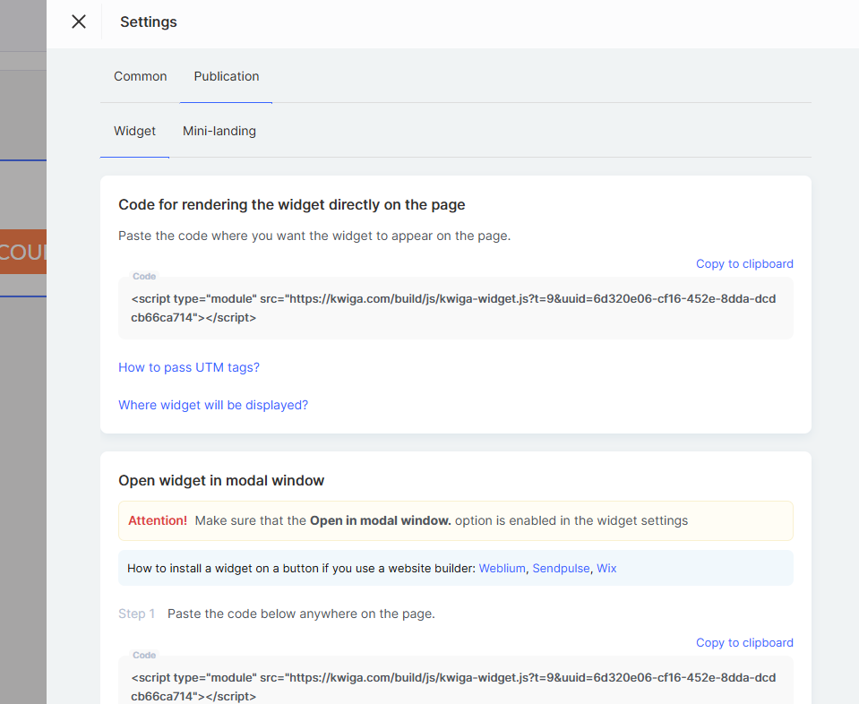 Attention! Adding a widget on the Kwiga platform (for webinars and courses) does not require any code.