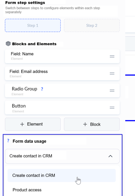 If you are creating a form from scratch, add a new Block using the +Block button. In the menu that appears, select Form. In the center of the screen, you will see the form itself, and on the left-side menu you can add or remove elements (the form content), as well as configure the appearance of the form and its elements.