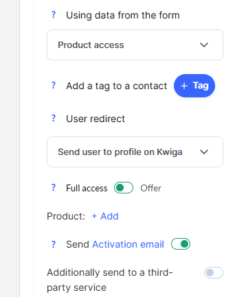 You can create a contact and immediately grant them access to a product. If full access is granted or access is provided via a free Offer, the contact receives access to the product and, after submitting the form, is redirected to the product’s presentation page.