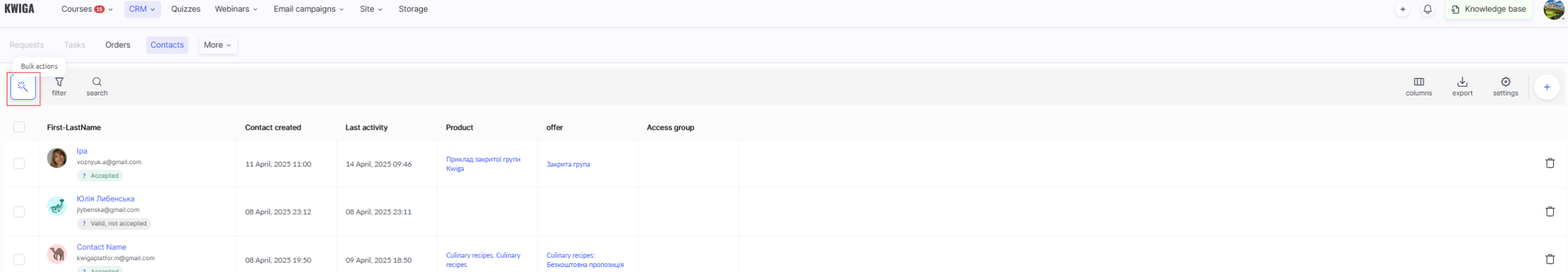 Note: Kwiga CRM also allows bulk actions on all or selected groups of contacts.