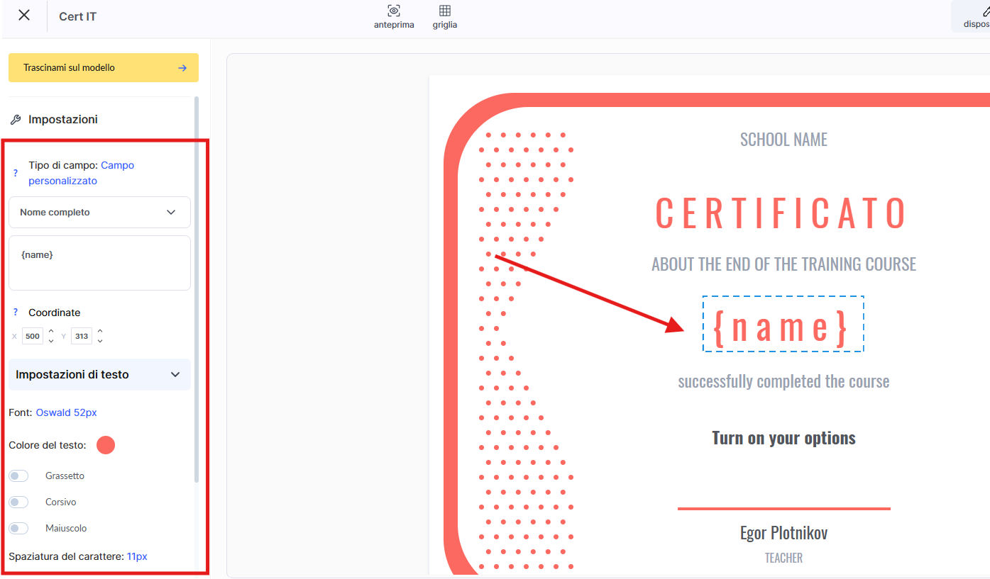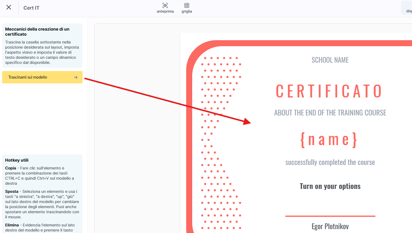 Utilizzando il pulsante giallo con l’etichetta "Trascinami sul modello a destra", puoi aggiungere un nuovo blocco di testo al certificato.