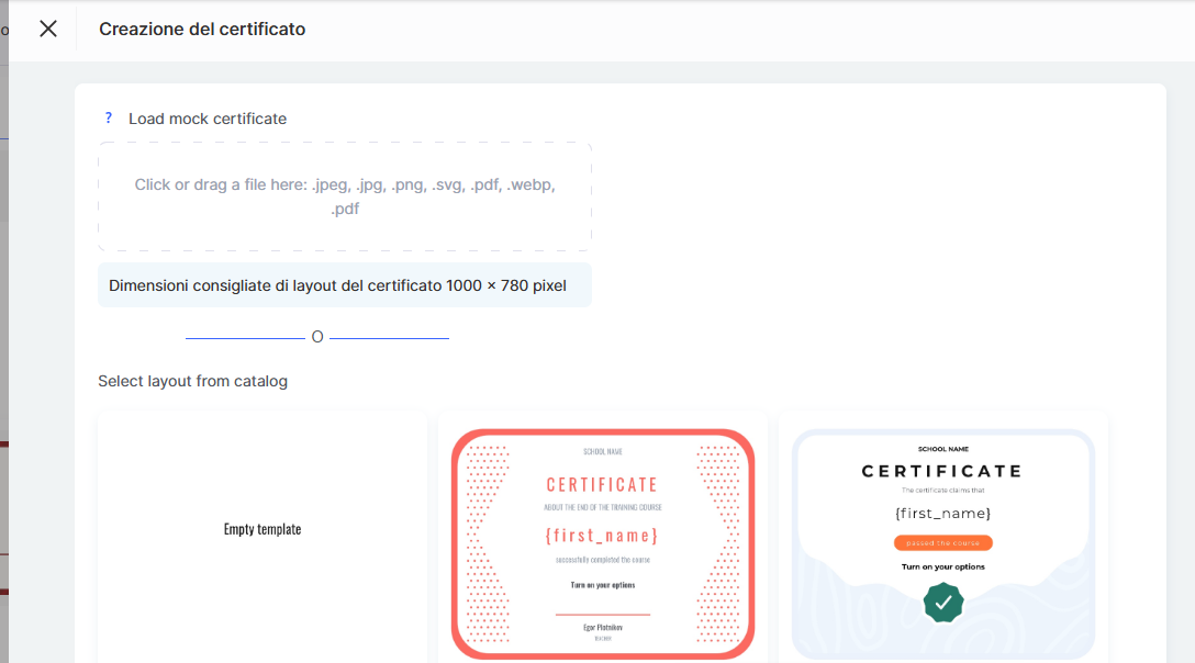 Scrivi il nome del certificato (ti consigliamo di usare lo stesso nome del corso per maggiore comodità) e seleziona la lingua del certificato.