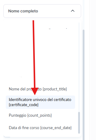 Inoltre al testo normale, puoi aggiungere una variabile (campo personalizzato) — cioè scegliere quali dati verranno inseriti automaticamente nel certificato in base alle informazioni dello studente.
