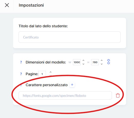 Dopo aver aggiunto il link del font nelle impostazioni del certificato, potrai selezionare quel font durante la modifica del testo.