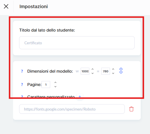• Pagine — se il design del certificato che hai caricato è composto da più pagine, indica il numero di pagine in questo campo.