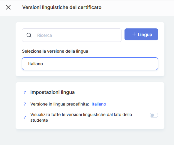 Puoi configurare il certificato in più versioni linguistiche (aggiungendone una nuova con il pulsante +Lingua), in modo indipendente dalla lingua del design del modello stesso.