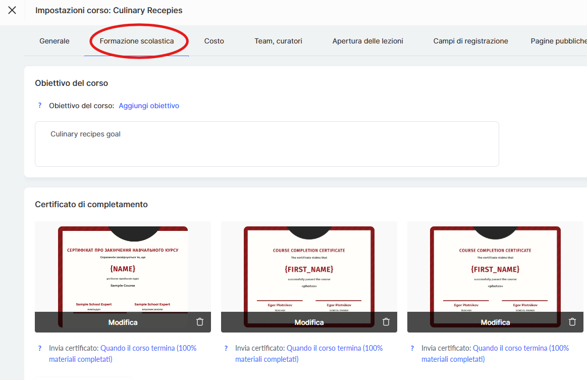 Puoi anche impostare un nome separato per una versione linguistica specifica del certificato — utile, ad esempio, se un corso internazionale richiede una versione in alfabeto latino mentre altre rimangono in cirillico.