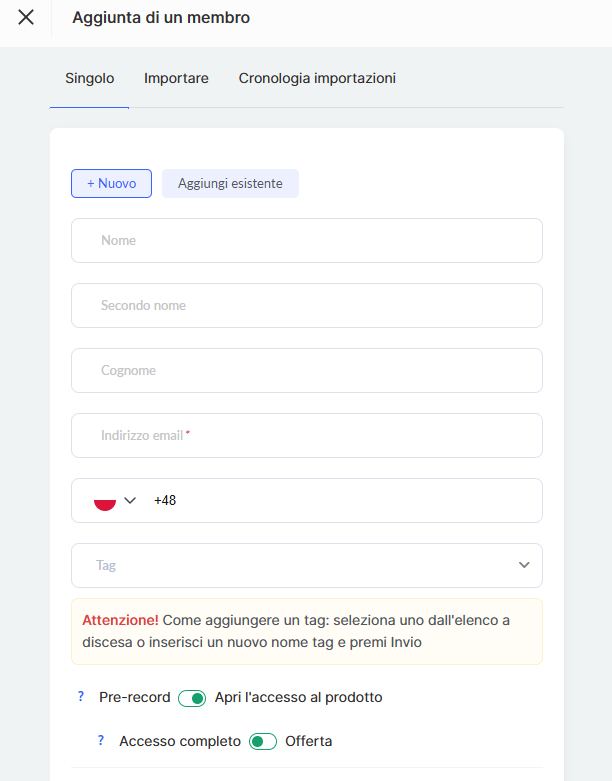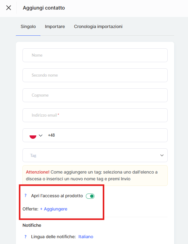 Se un contatto è già stato aggiunto alla piattaforma, ma l’accesso al prodotto non è ancora stato aperto, puoi aprire l’accesso direttamente dalla scheda del contatto.