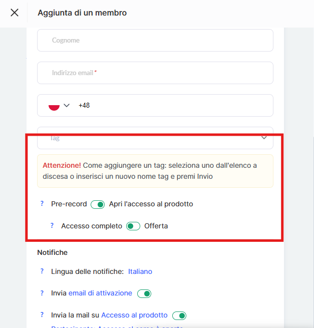 Compila il modulo: assicurati di includere l’indirizzo email. Puoi anche attivare l’opzione Apri accesso al prodotto, scegliere un’offerta e fare clic su Salva.