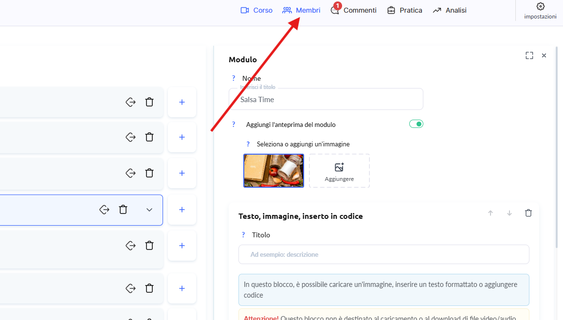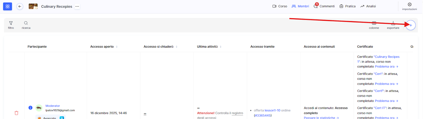 Nella sezione Corsi, apri il corso desiderato e vai alla scheda Membri.