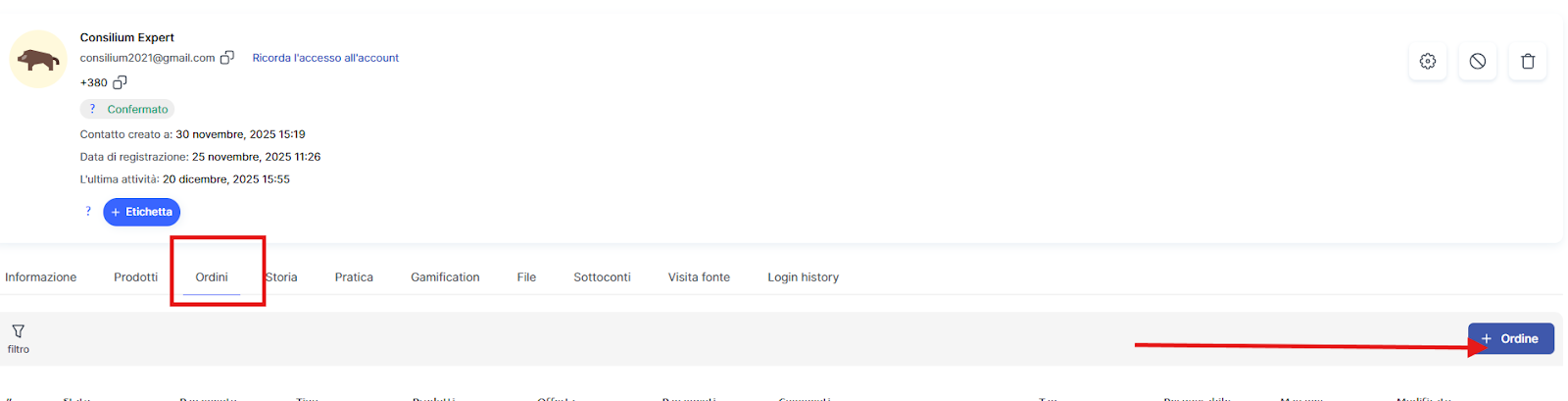 Aggiungere un ordine personalizzato nella scheda di un contatto: