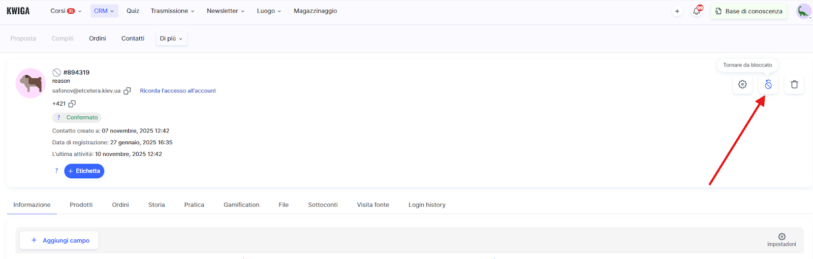 Nella scheda del contatto vedrai una nota che indica che l’utente è stato bloccato, oltre a un pulsante per sbloccarlo.