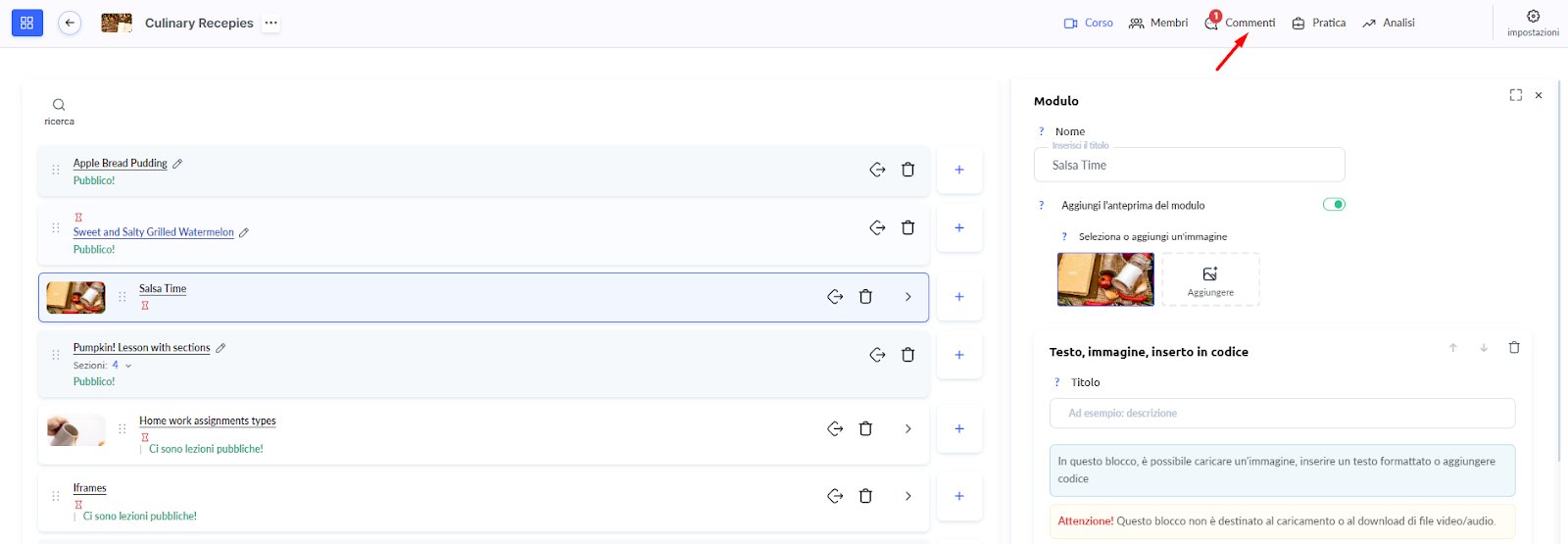Per aggiungere un blocco di commenti, apri il corso, vai alla lezione desiderata e usa il pulsante Commenti per inserire un blocco dove necessario.