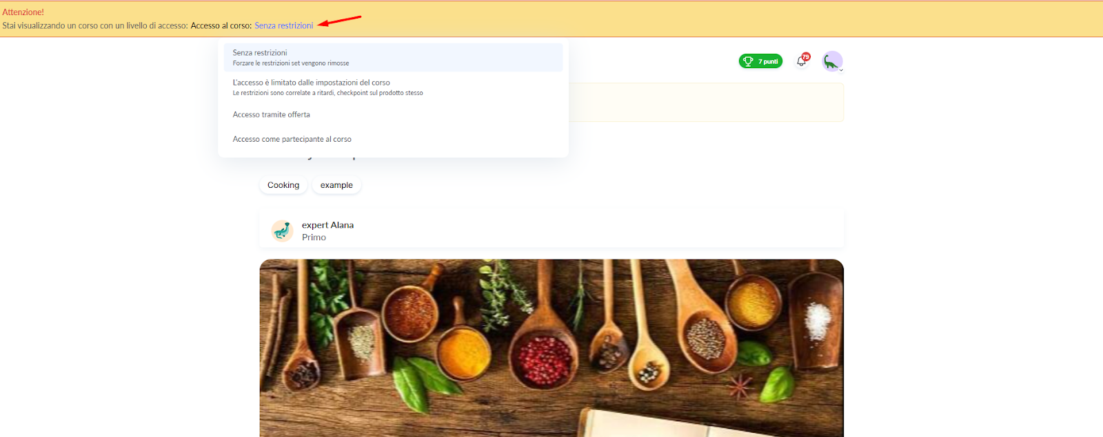 Accesso illimitato – Visualizzi il corso senza alcuna limitazione. Ciò significa che se il corso ha ritardi nella pubblicazione delle lezioni o checkpoint configurati, questi non influenzeranno ciò che vedi: potrai accedere a tutte le lezioni. Questa modalità è utile per controllare tutti i materiali prima della pubblicazione.