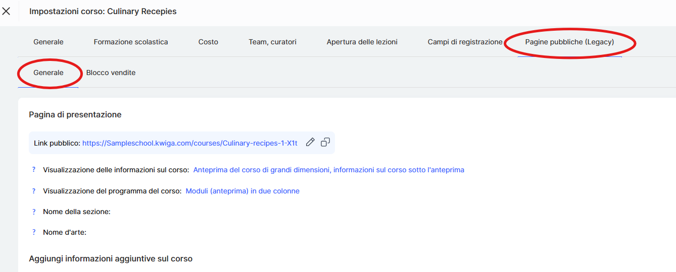 Nella scheda Pagine pubbliche, seleziona la sezione Generale e scorri verso il basso fino a Pagina della lezione / del modulo.