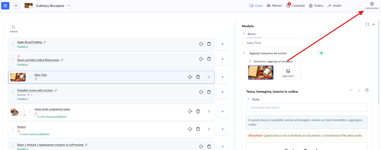 È anche un posto molto comodo per aggiungere link alla chat Telegram del corso o alla riunione Zoom, così gli studenti avranno sempre un accesso rapido alle risorse importanti e aggiornate.