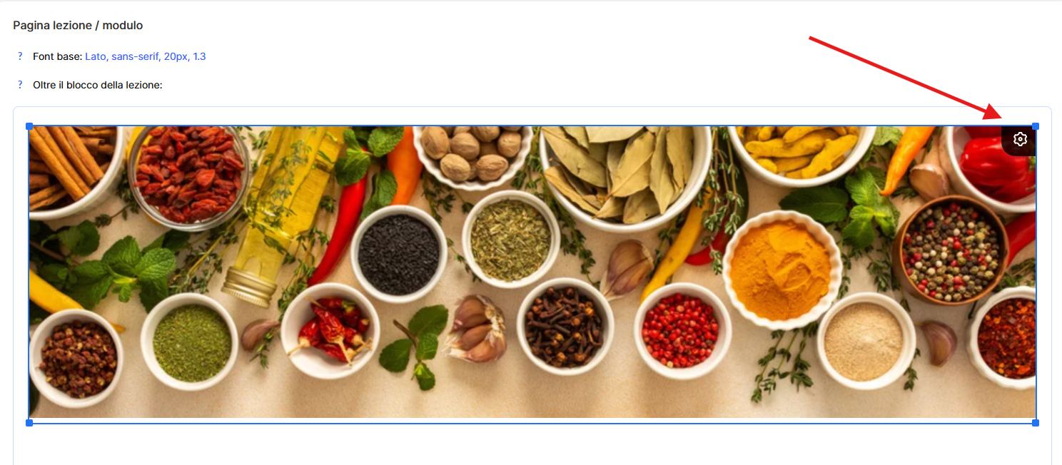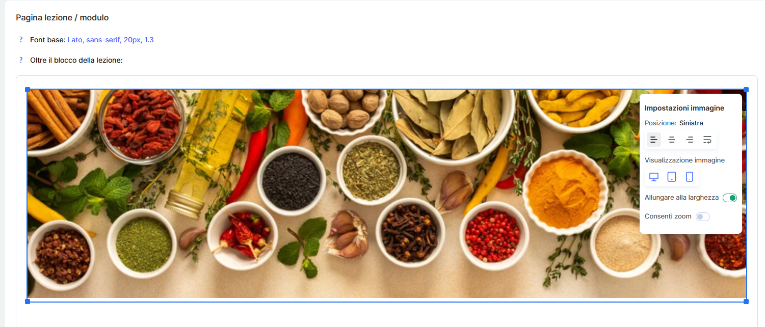 Se aggiungi un’immagine al blocco sopra le lezioni, puoi regolare come verrà visualizzata sui vari dispositivi.