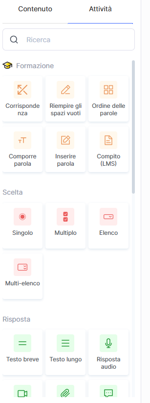 Puoi utilizzare test con risposte a scelta singola o multipla, esercizi di abbinamento, esercizi di completamento, attività di ordinamento oppure esercizi interattivi come la costruzione di parole o frasi.