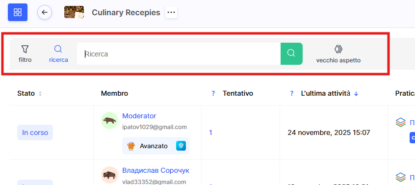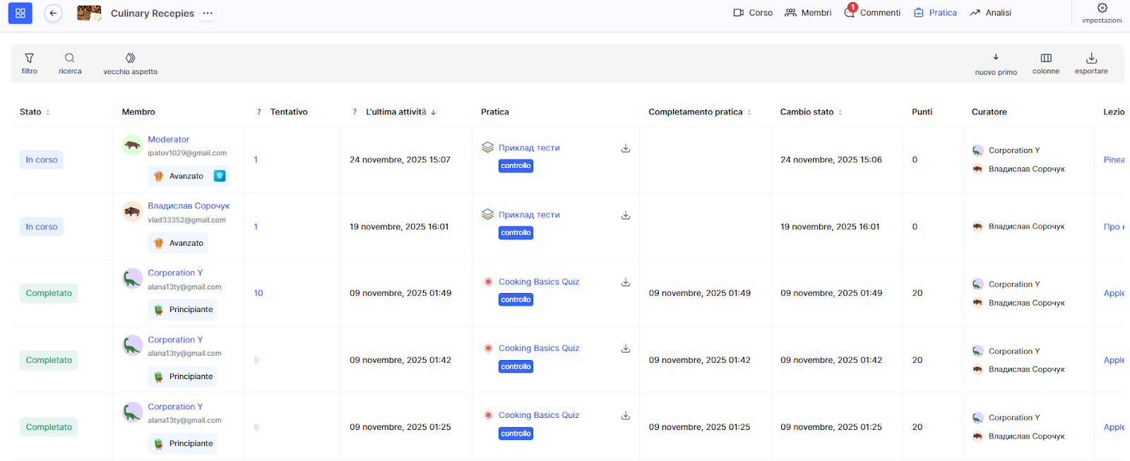 I parametri principali includono il curatore, i tentativi (tutti o solo l’ultimo), lo stato dell’esercitazione (Completata, Non completata, In corso, ecc.), la lezione e il modulo in cui si trova l’attività, nonché le offerte del piano del partecipante.