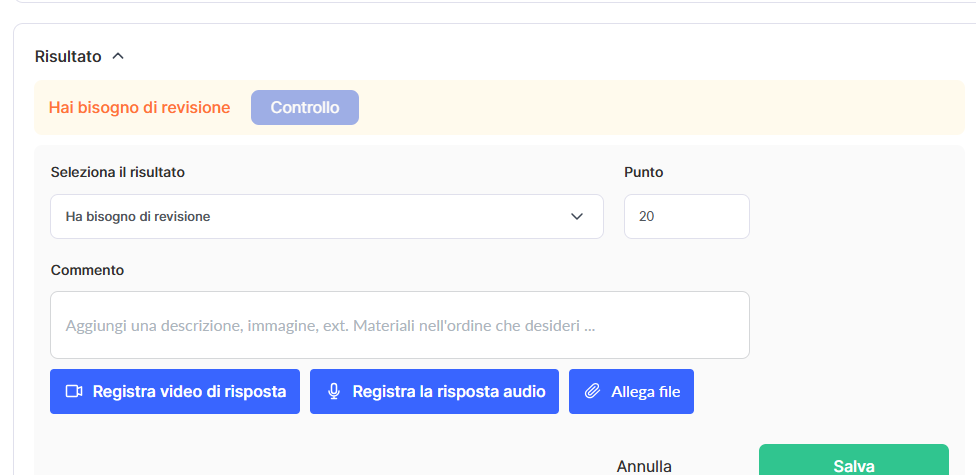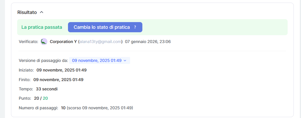 Puoi inoltre modificare il risultato dell’esercitazione anche se la piattaforma ha assegnato automaticamente una valutazione diversa; questa opzione è utile quando è necessario tenere conto di circostanze individuali.
