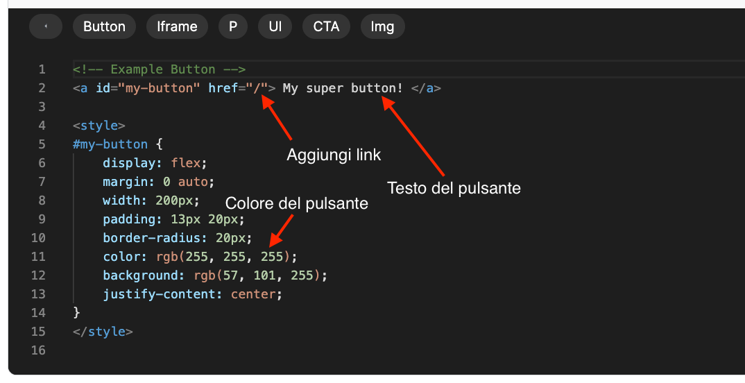 L’editor di codice si aprirà (un’area nera sullo schermo) e nella parte superiore del menu vedrai pulsanti con modelli di codice pronti all’uso. Per creare un pulsante, seleziona Button: