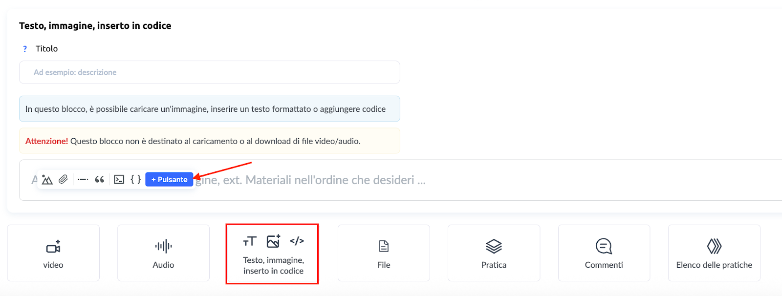 Apri la lezione in cui desideri aggiungere un pulsante e inserisci l’elemento “Testo, Immagine, Incorporamento di Codice”.