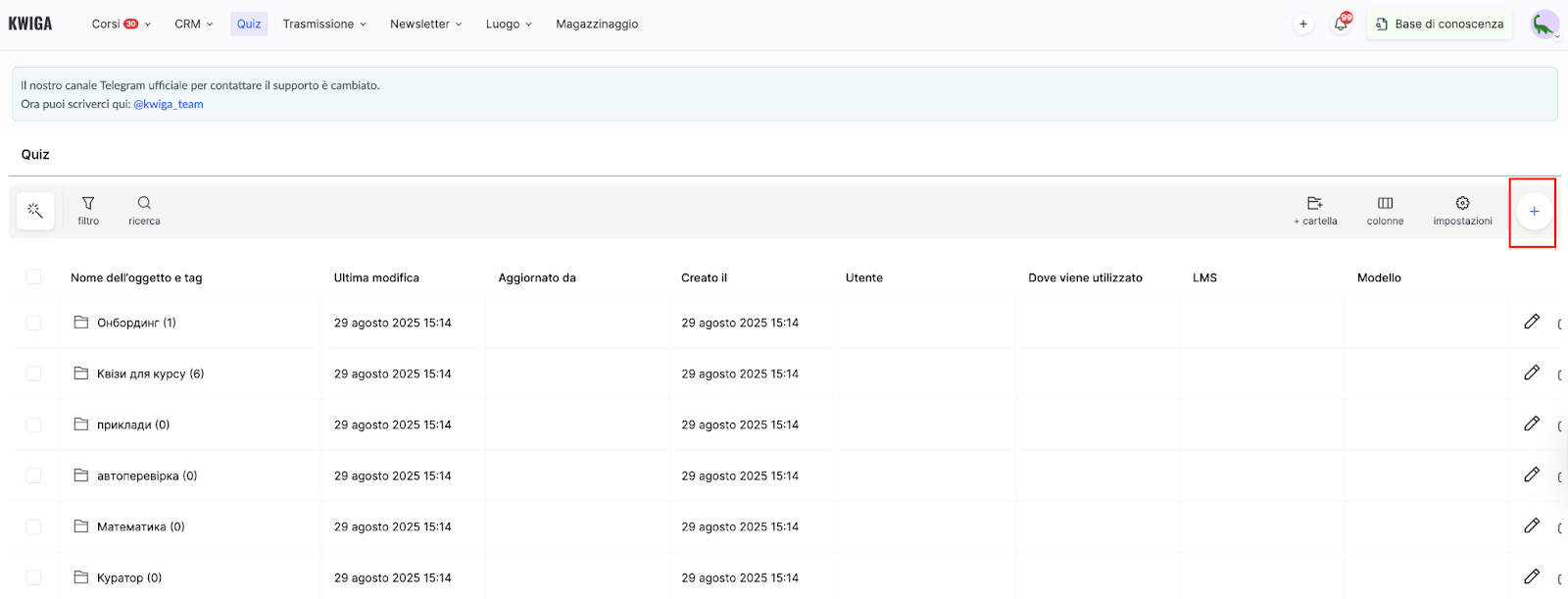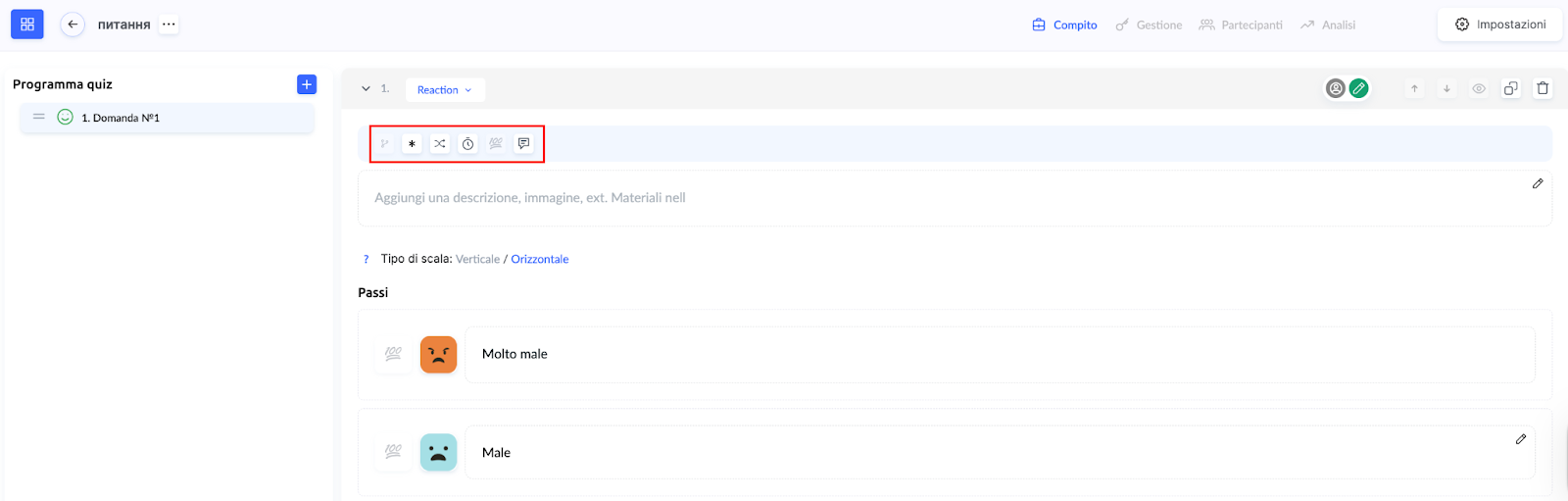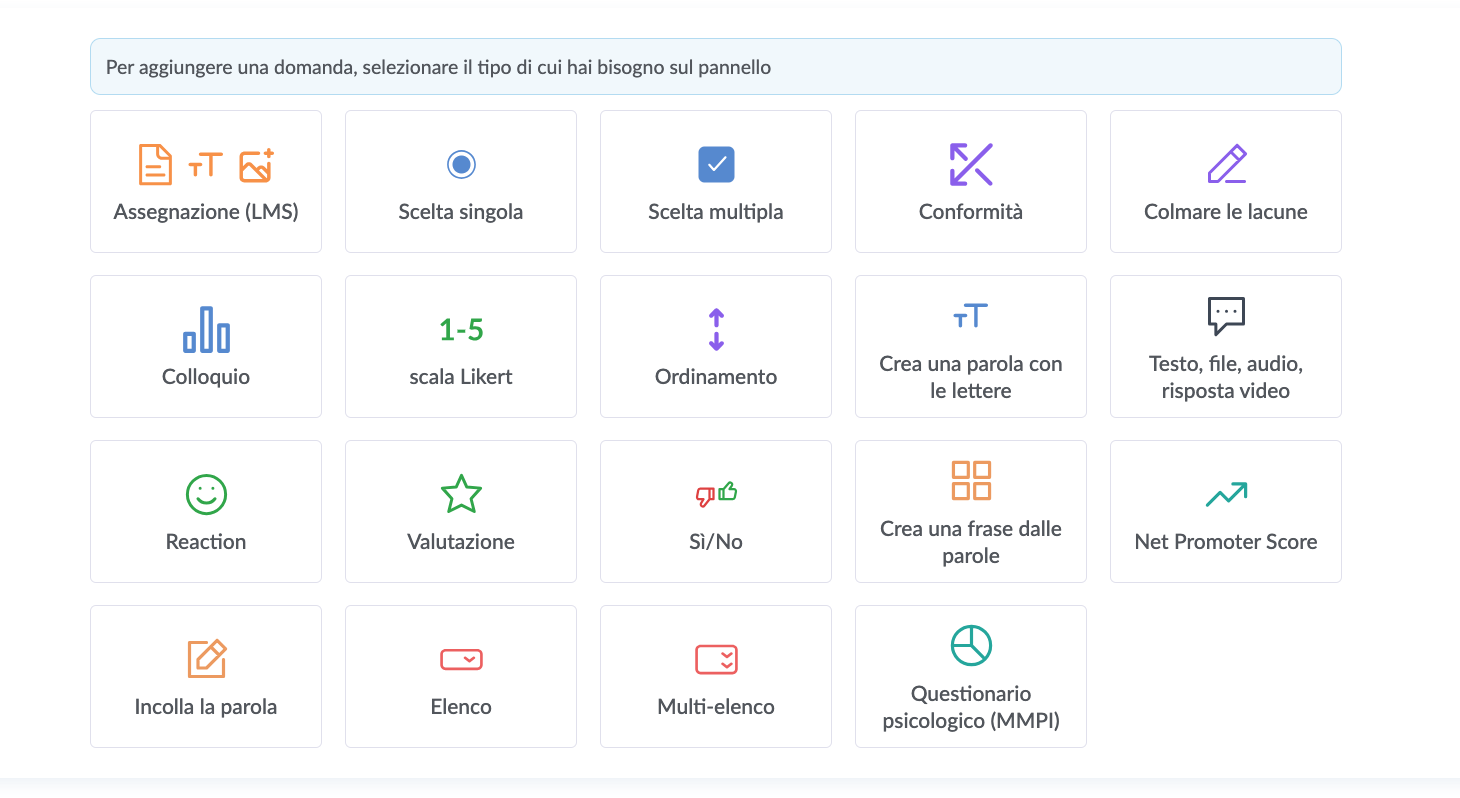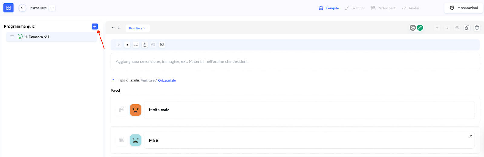 Ogni nuova domanda può essere aggiunta cliccando sul pulsante + nell’editor dei quiz. Il processo è semplice: scegli il tipo di domanda, scrivi il contenuto e aggiungi le risposte se il tipo lo richiede.