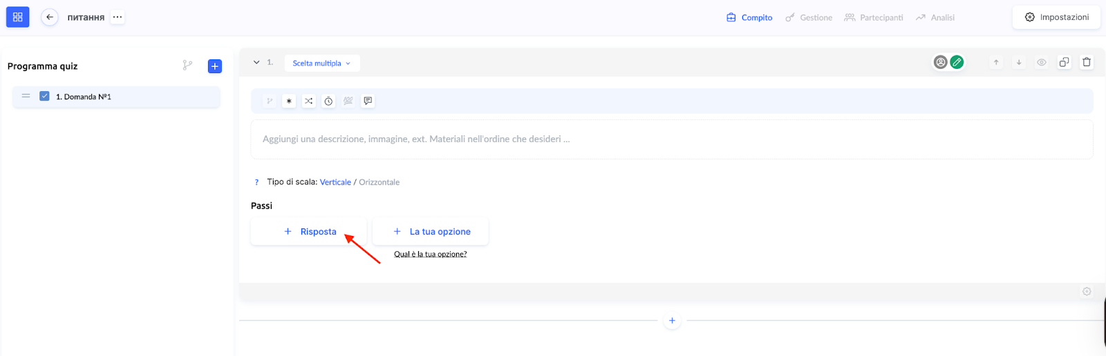 Inserisci il testo della domanda e le opzioni di risposta cliccando sul pulsante + Risposta. Puoi assegnare punti alle risposte corrette e contrassegnarle in verde.
