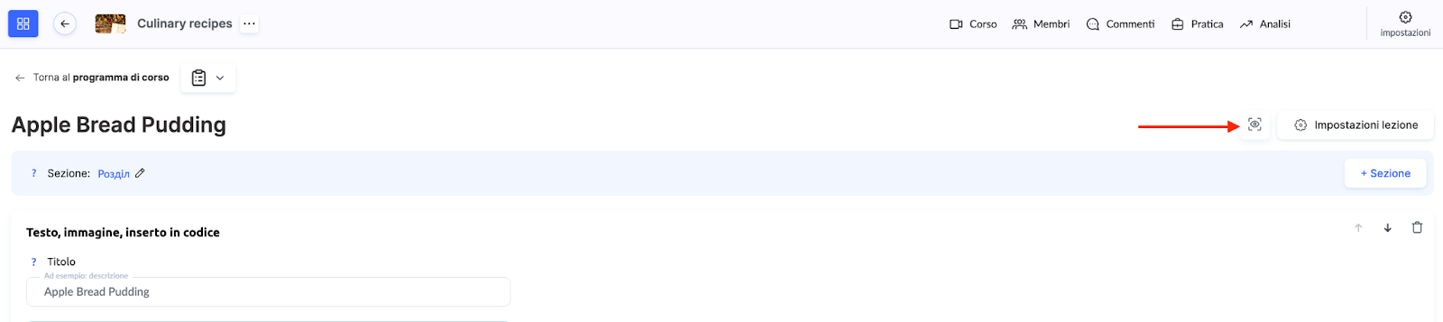 Dopo aver aggiunto il compito, gli studenti lo vedranno nel contenuto della lezione. Puoi usare la funzione di anteprima per assicurarti che tutto sia corretto: apri l’Editor delle lezioni, passa alla modalità anteprima e verifica come il compito appare dalla prospettiva dello studente.