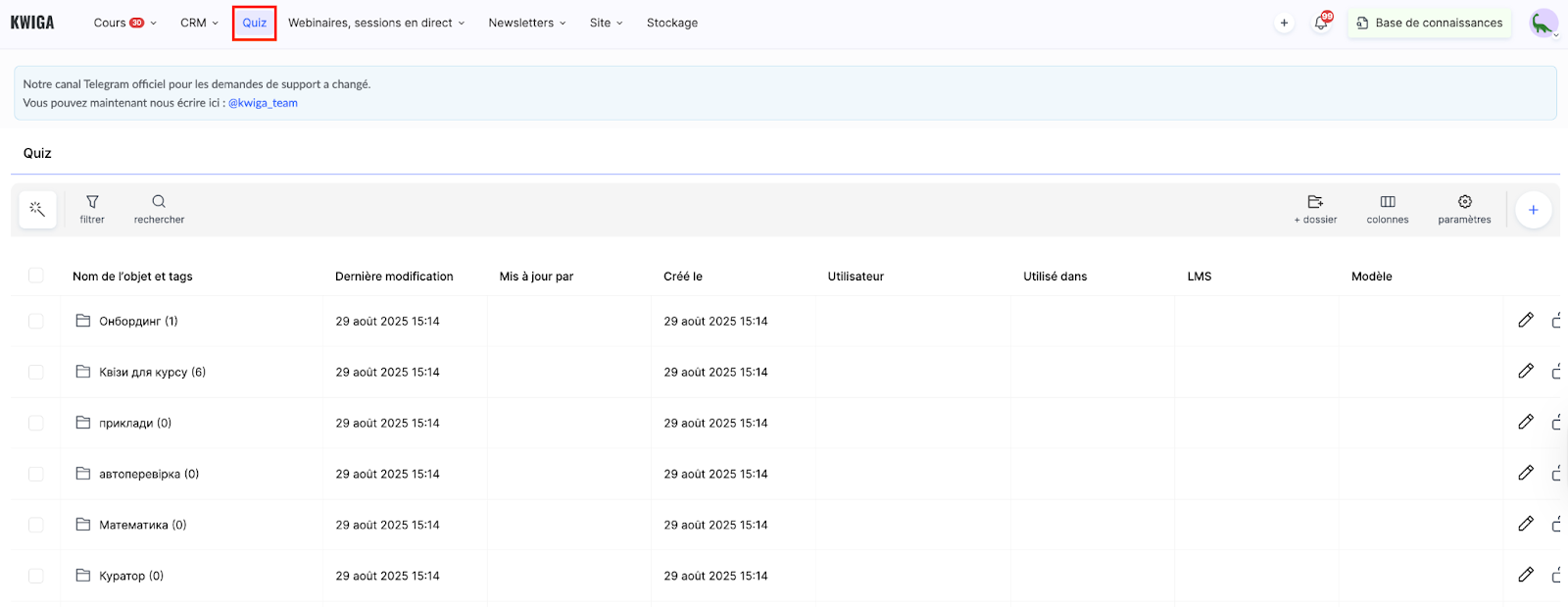 La piattaforma Kwiga permette di creare test che facilitano la valutazione delle conoscenze degli studenti. I test vengono creati separatamente dalle lezioni e si trovano nella sezione Quiz.