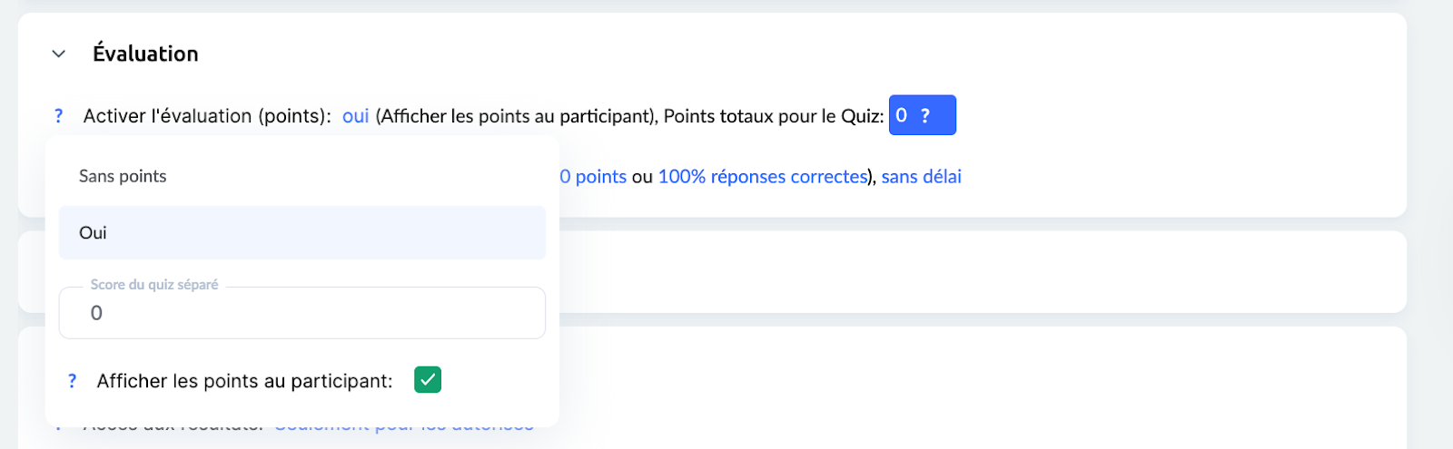 La valutazione può essere attivata o disattivata a seconda degli obiettivi del test. Se è attivata, gli studenti riceveranno punti per le risposte corrette. Puoi anche decidere se mostrare loro il risultato oppure nasconderlo.