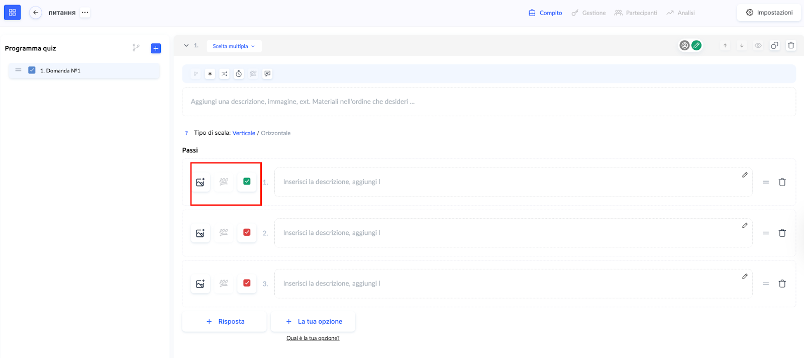 Puoi modificare l’ordine delle domande spostandole verso l’alto o verso il basso nel programma del quiz. Per eliminare una domanda, clicca sull’icona del cestino. Combinando diversi tipi di domande e impostazioni, puoi creare test di qualsiasi livello di difficoltà, verificando in modo efficace le conoscenze degli studenti.