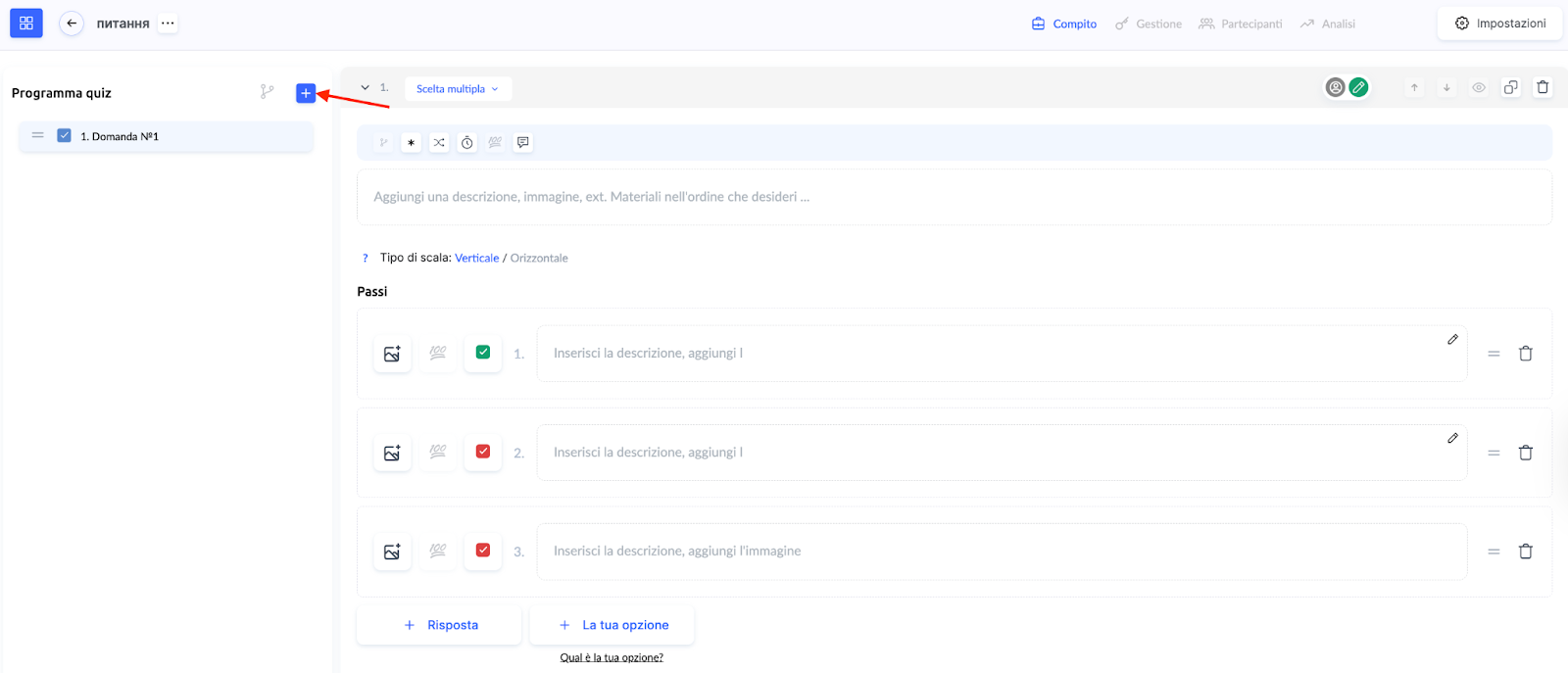 Tutte le modifiche vengono salvate automaticamente. Per aggiungere una nuova domanda, utilizza l’opzione + nel programma del quiz. Poi basta scegliere il tipo di domanda, inserire il testo e aggiungere le risposte.